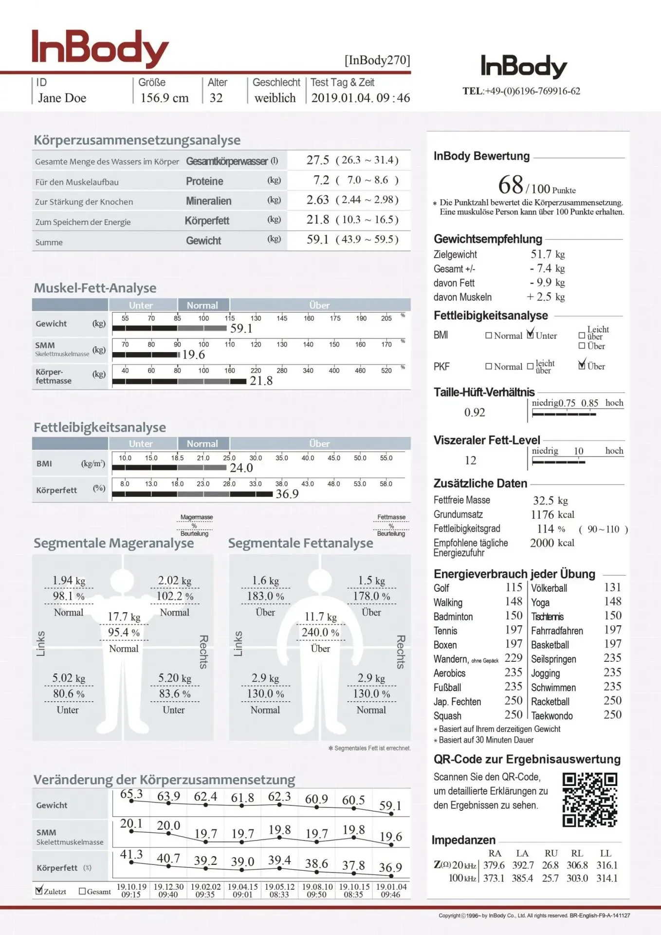 Ergebnisse:Das Gerät generiert in wenigen Minuten einen detaillierten Bericht über die Körperzusammensetzung.
